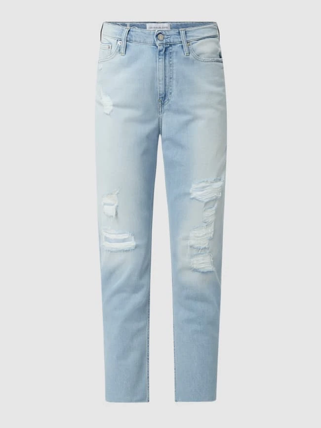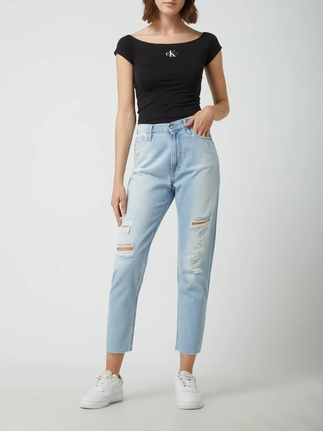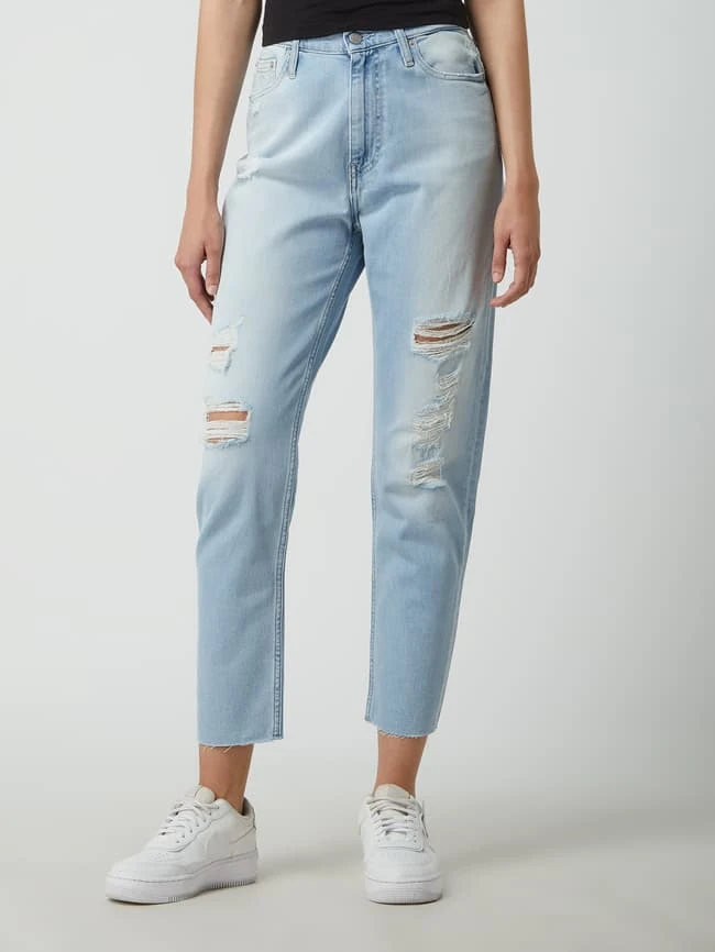 Die Jeans von Calvin Klein Jeans ist aus einem Baumwoll-Elasthan-Mix gefertigt. Sie kommt im Mom Fit mit Destroyed-Effekten, hohem Bund und Logo-Stickerei. Gut zu wissen: High Waist Hosen betonen die Taille und kaschieren den Bauch.