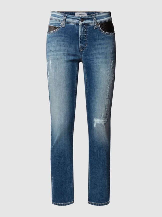 Die Jeans von Cambio ist aus einem Baumwoll-Mix mit Stretch-Anteil gefertigt und gerade geschnitten. Sie kommt in 5-Pocket-Design und Destroyed-Look, mit Strasssteinbesatz, Knopf- und Reißverschluss sowie Label-Patch.